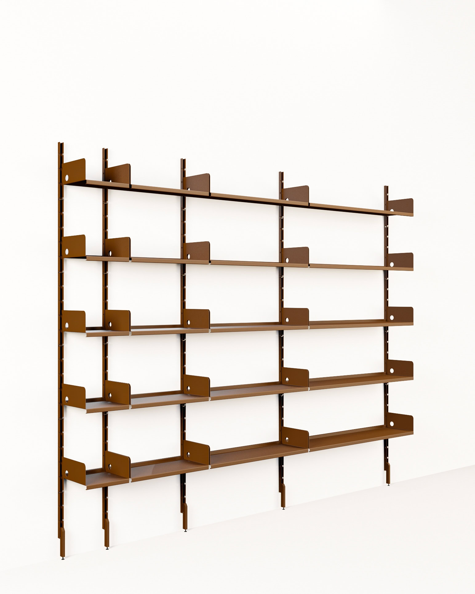 Sistema da parete, altezza 200 cmComposizione, 5 montanti H 200 cm, 5 piedini, 5 ripiani 25×25 cm, 5 ripiani 50×25 cm, 5 ripiani 75×25 cm, 5 ripiani 100×25 cm