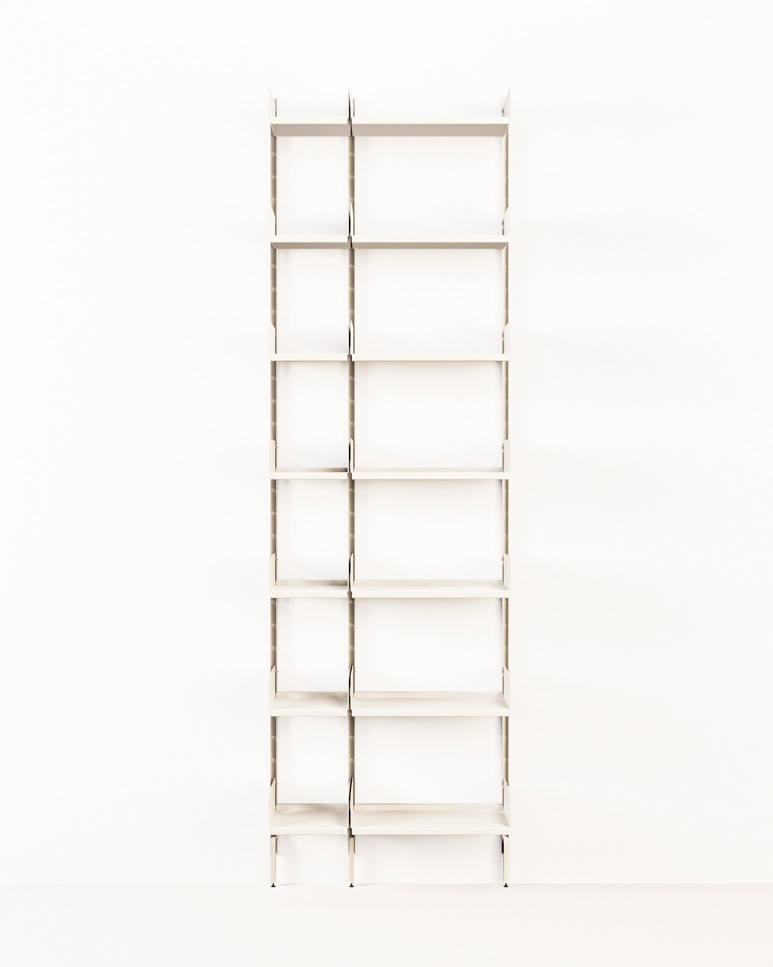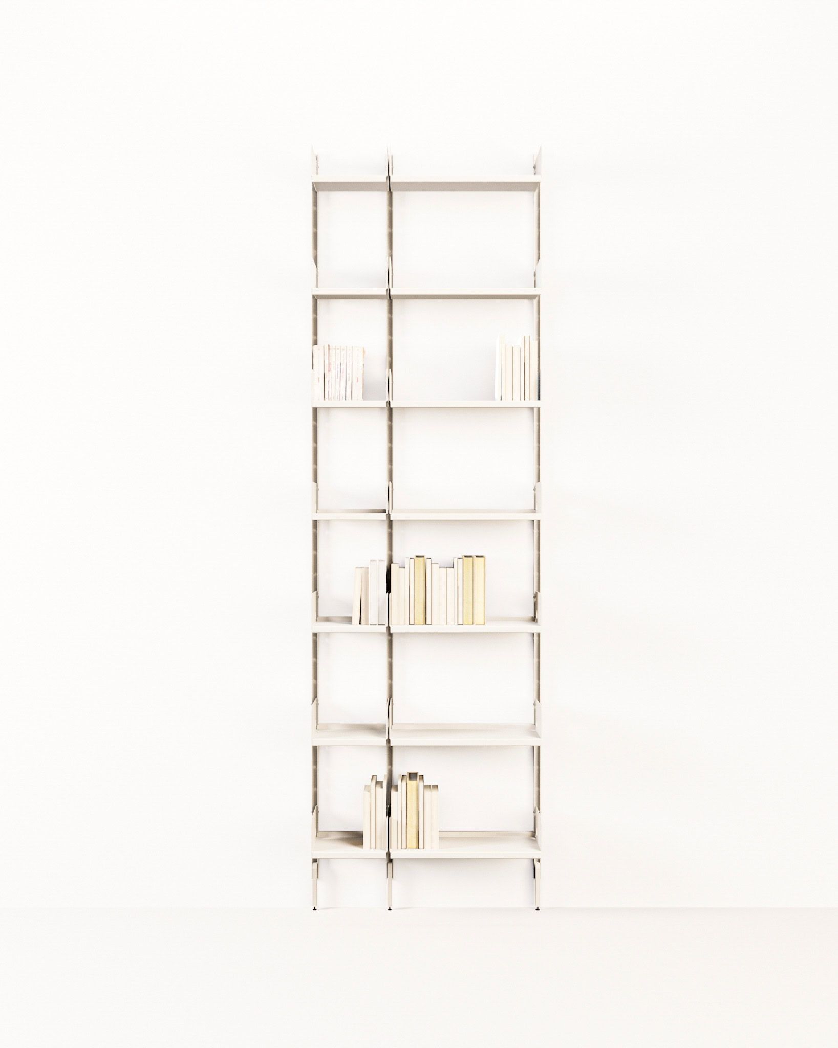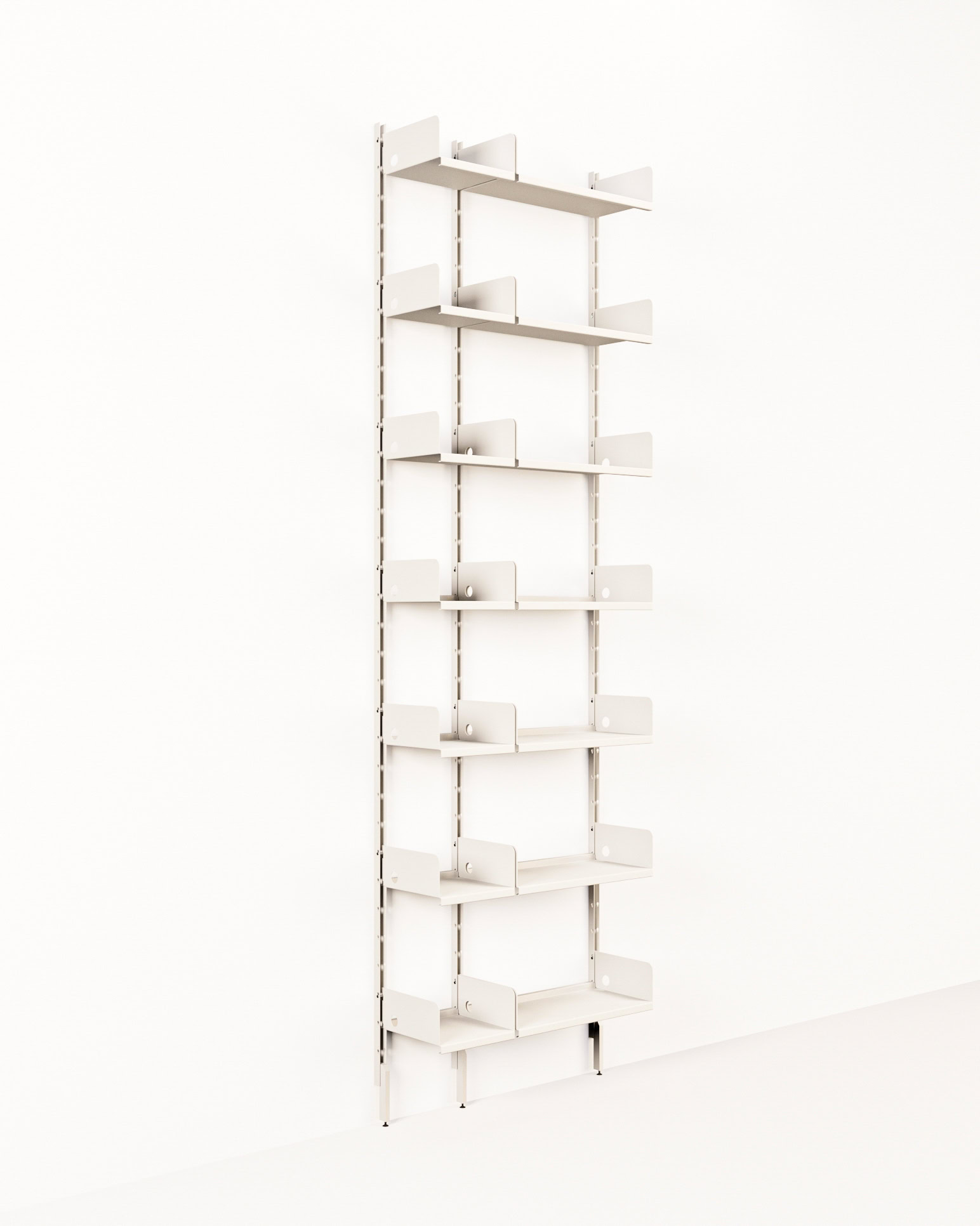 Sistema da pareteComposizione, 3 montanti H 250 cm, 3 piedini, 7 ripiani 25×25 cm, 7 ripiani 50×25 cm