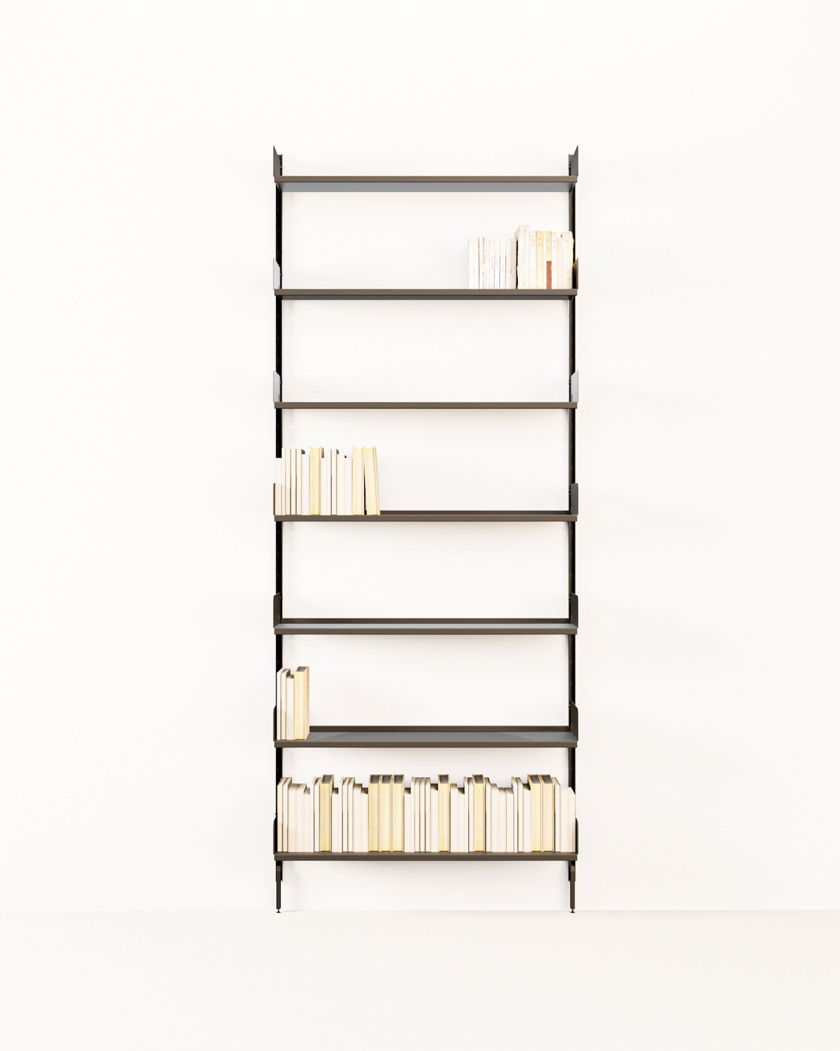 Nel living, in cucina, nello studio, nella stanza da letto o in lavanderia, gli elementi che compongono Alphabetica possono essere combinati per soddisfare tutte le esigenze e per adattarsi ad ogni ambiente. Il sistema è semplice e intuitivo, è composto da montanti e ripiani. Il sistema da parete Alphabetica si adatta ad ogni situazione perchè è composto da montanti con tre altezze differenti – 150, 200 e 250 cm – e ripiani e ripiani rovesciati con larghezze e profondità diverse.