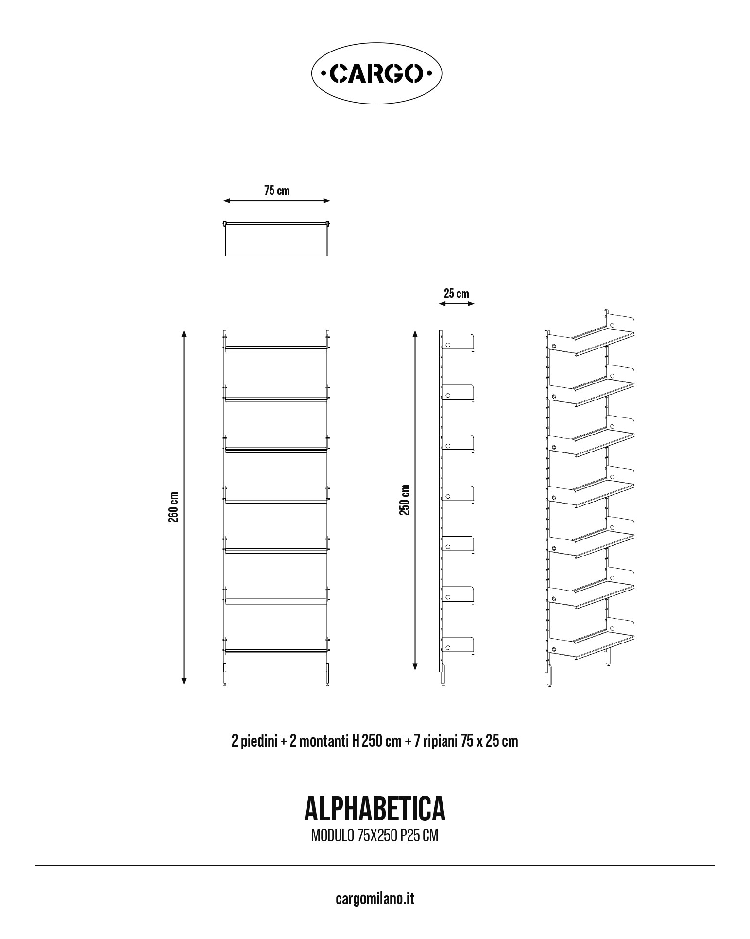Modulo ripiano largo 75 cm, H 250 cm, 2 piedini, 7 ripiani 75×25 cm