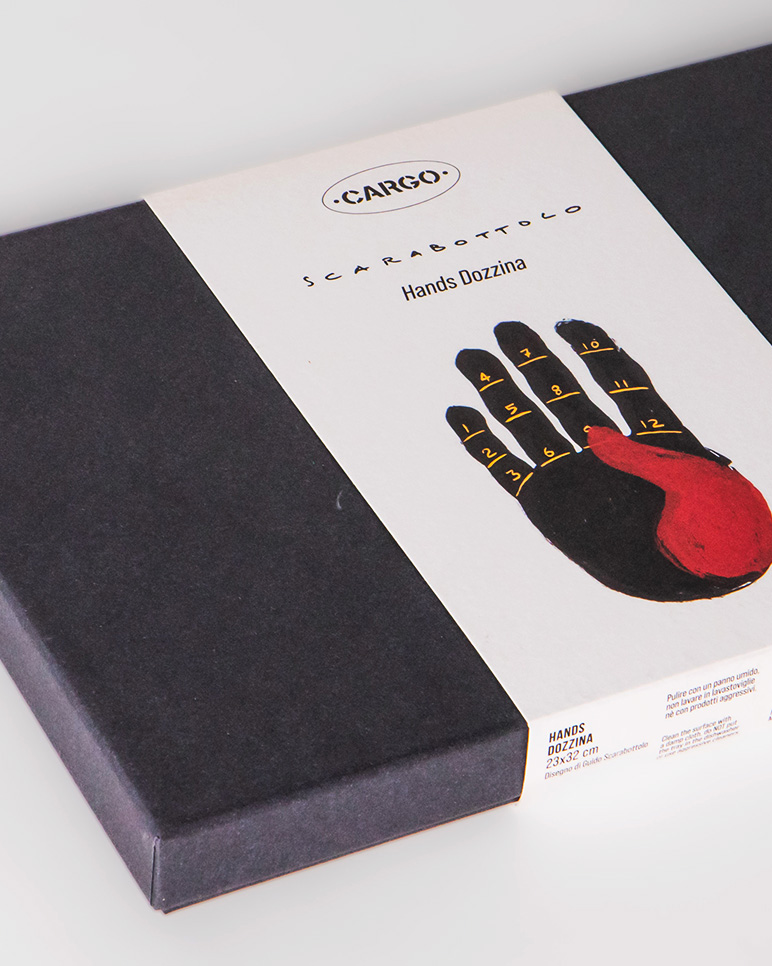 Il vassoio DOZZINA della collezione Hands, realizzato in collaborazione con Scarabottolo, fa parte della Cargo Gallery: la linea di edizioni speciali della Cargo Collection dedicata a oggetti d’arredo e d’uso quotidiano valorizzati dal contributo di illustratori e grafici contemporanei.