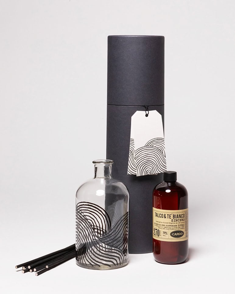 Le bottiglie–diffusori, parte della Cargo Gallery, trasformano l’uso quotidiano in un gesto di stile grazie all’intervento di grafici e illustratori che rendono ogni pezzo unico e narrativo.
