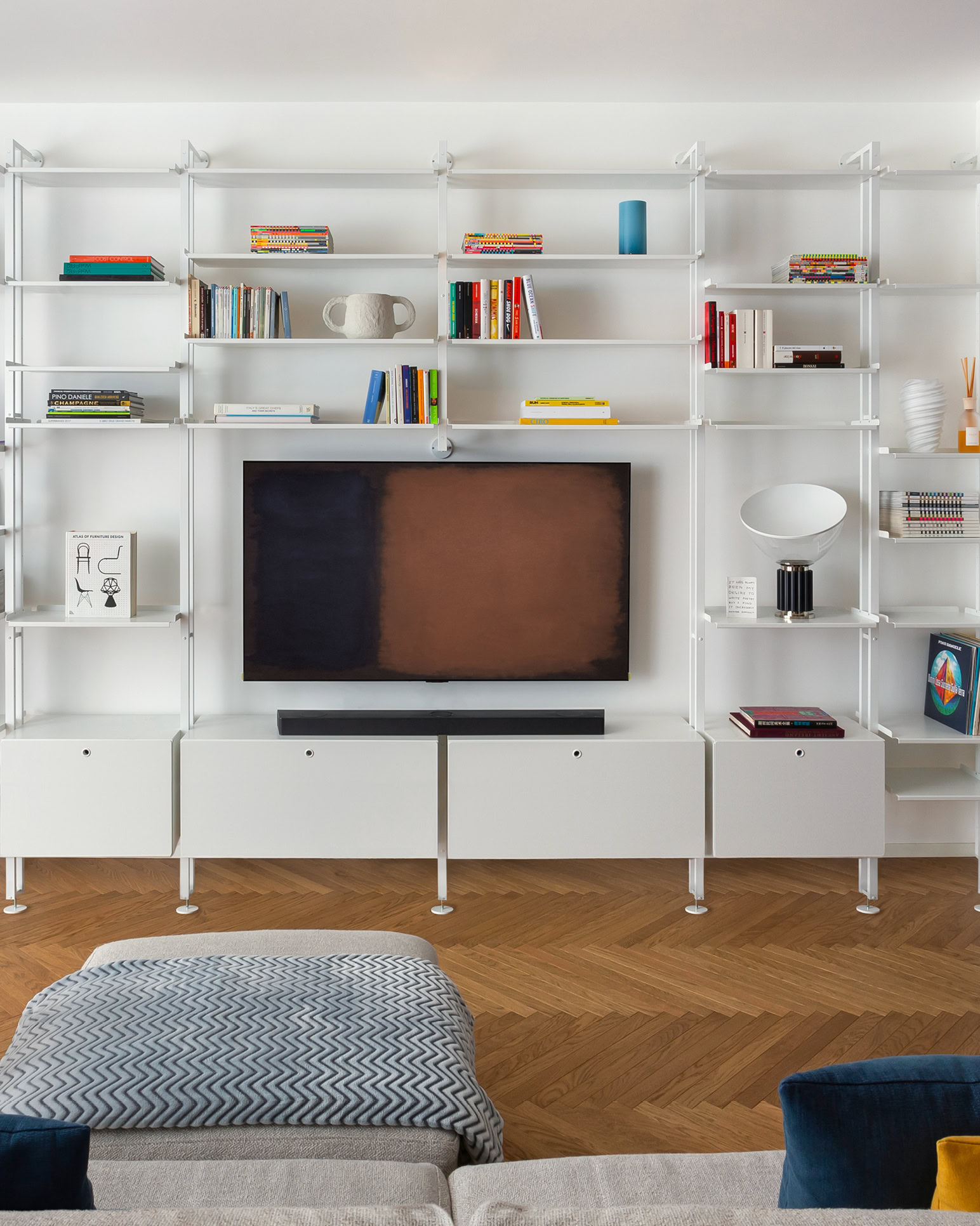 È la soluzione ideale per gli ambienti open space. La versione cielo-terra divide gli spazi lasciando passare la luce, mentre la versione a parete è leggera, non necessita di molti punti di fissaggio, ma soprattutto è solida. In entrambi i casi la struttura è bifacciale, composta da montanti verticali in alluminio.