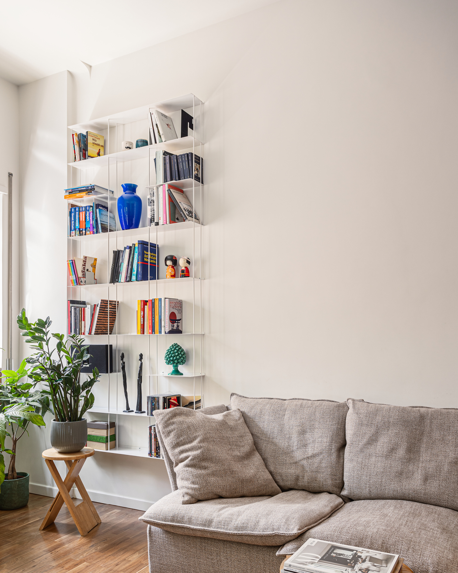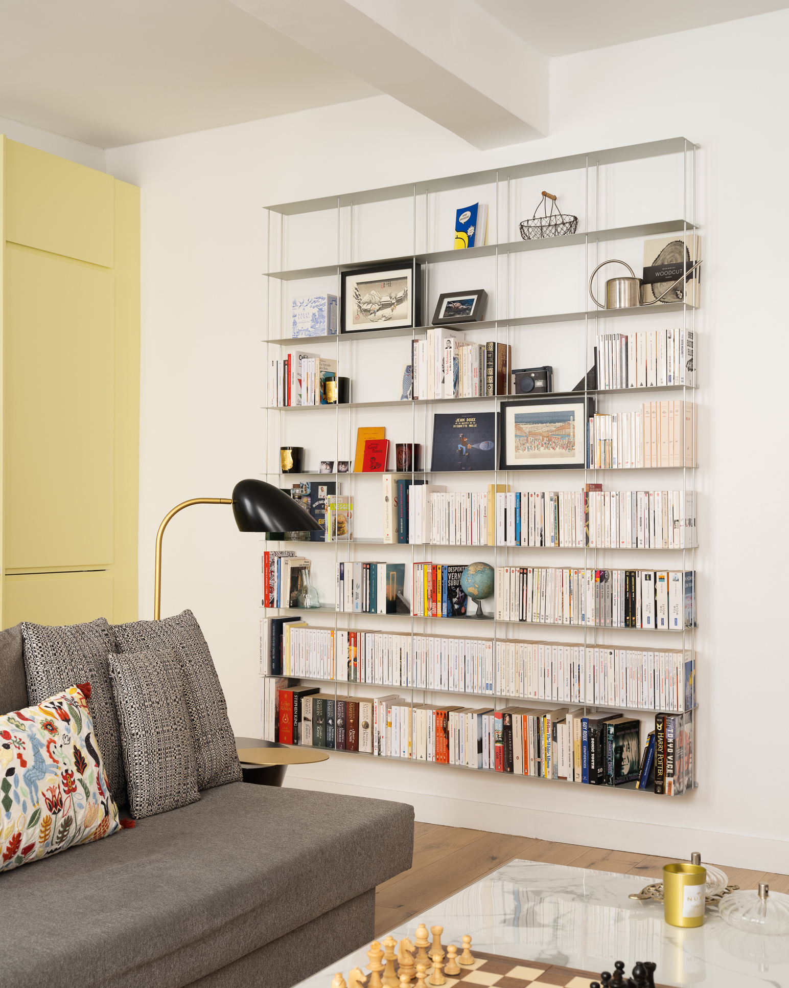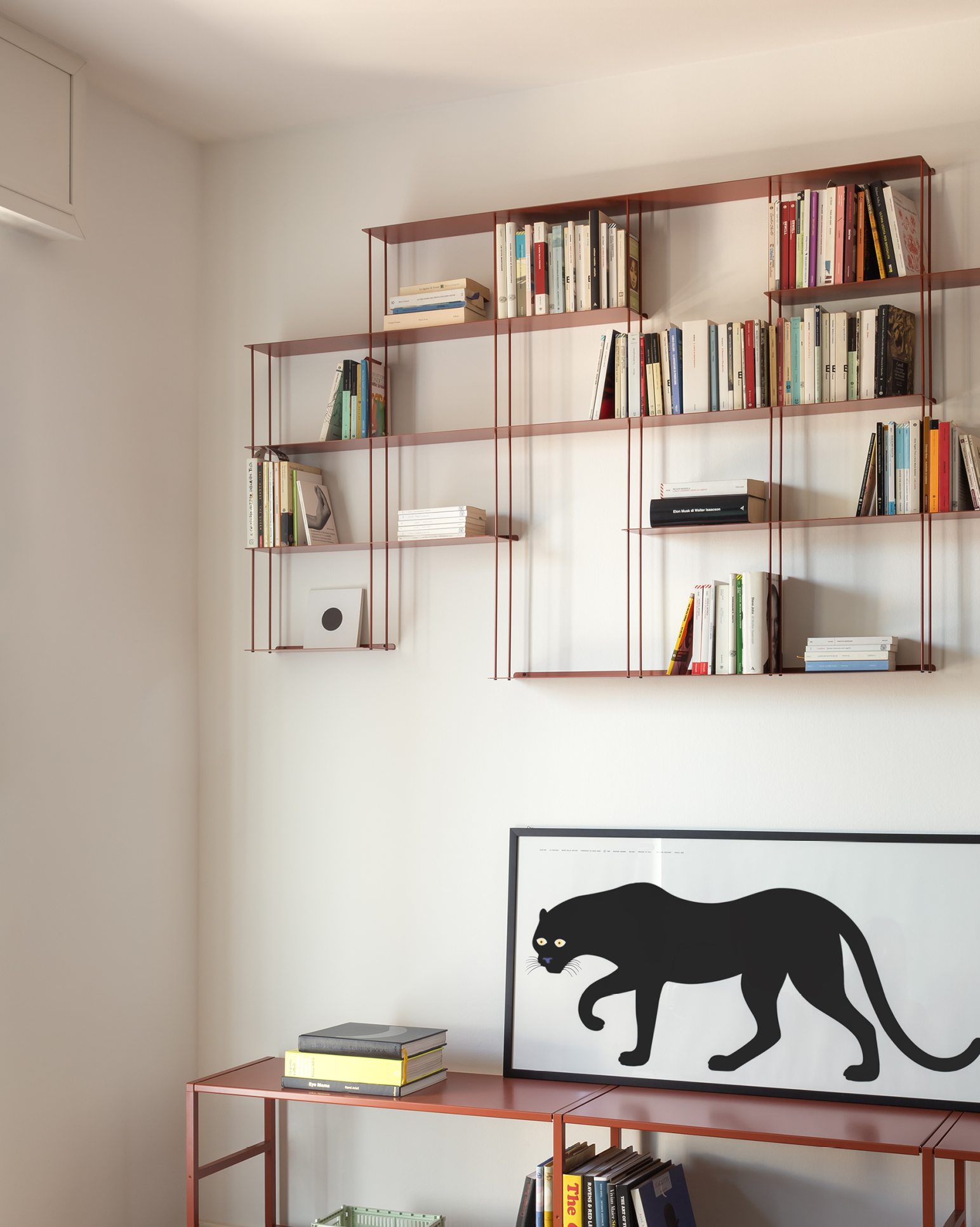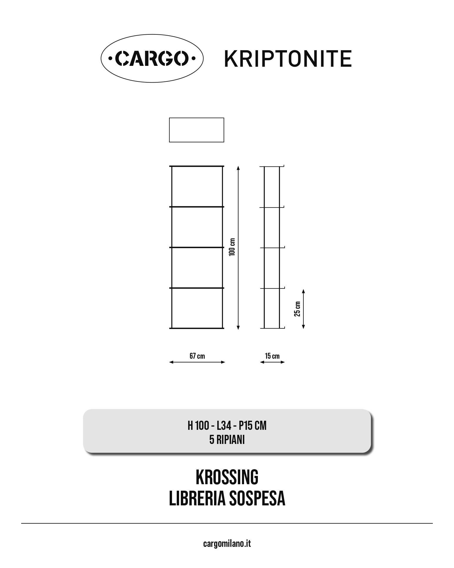 La libreria Krossing è un sistema a parete realizzato con piani e tubetti in alluminio. Rappresenta la libreria nella sua essenza, con enormi capacità di sostegno e un minimo ingombro. Può accogliere e valorizzare libri, profumi, vasi e anche bicchieri.