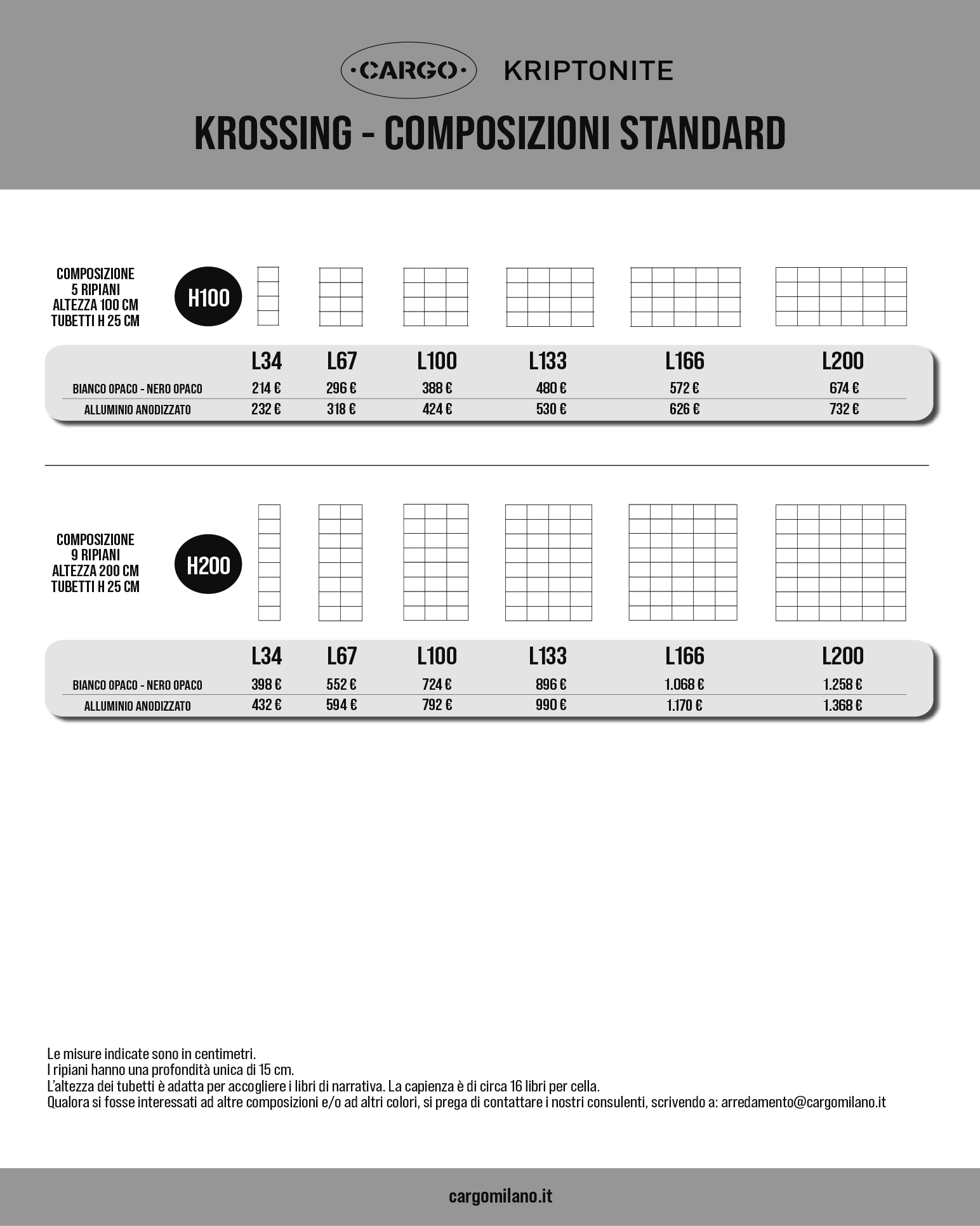 Le composizioni standard sono alte 100 cm con 5 ripiani oppure sono alte 200 cm con 9 ripiani. La larghezza varia, da 34 cm fino a 200 cm.