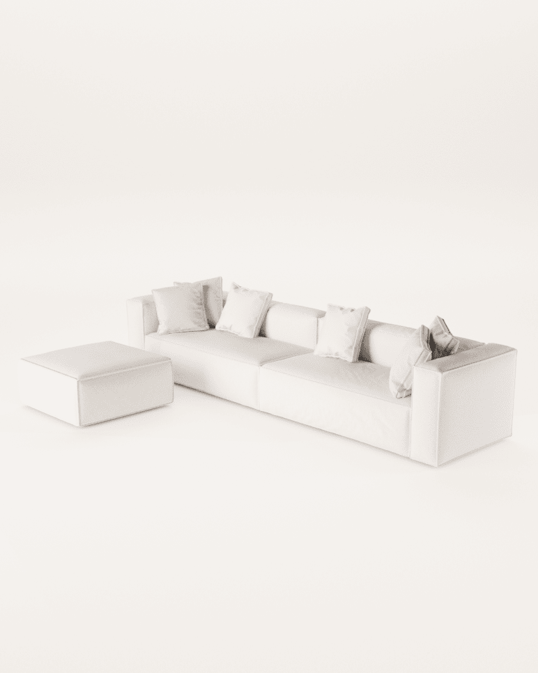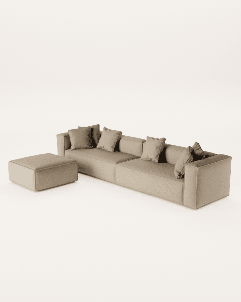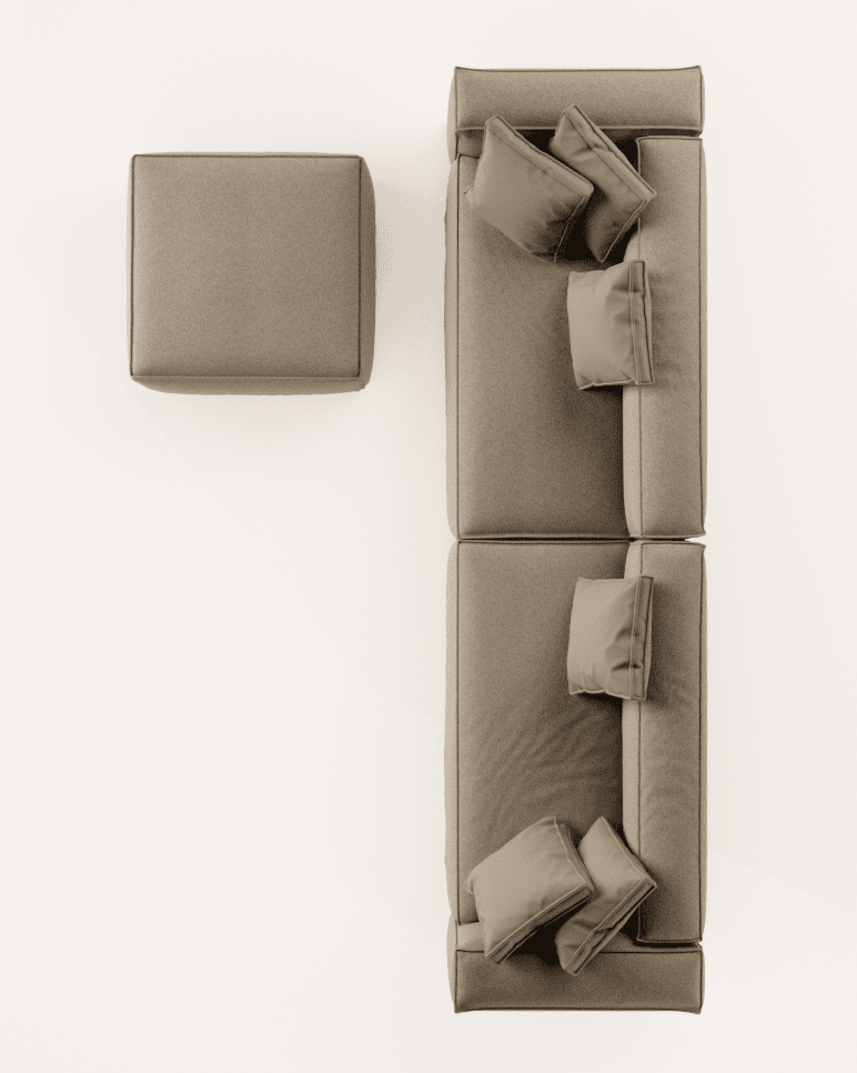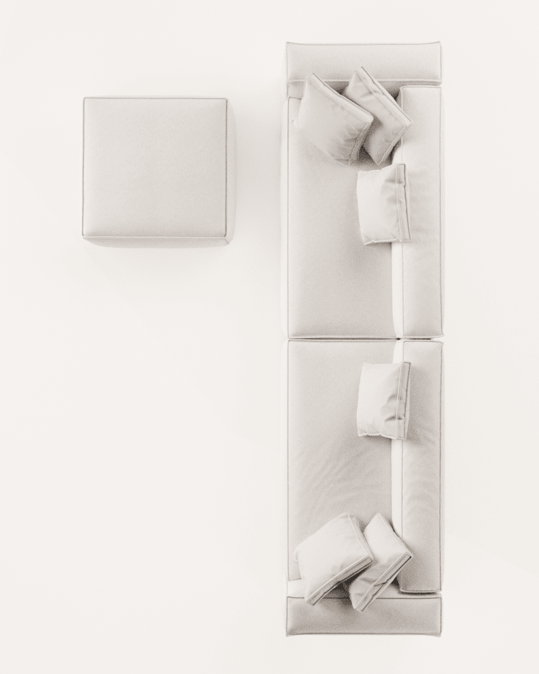 Le linee pulite e la versatilità del pouf rendono la composizione adatta a molteplici utilizzi: può essere usato come estensione del divano, come seduta supplementare oppure come piano d’appoggio temporaneo. Una proposta raffinata e funzionale, progettata per valorizzare l’ambiente domestico con equilibrio, praticità e comfort contemporaneo.