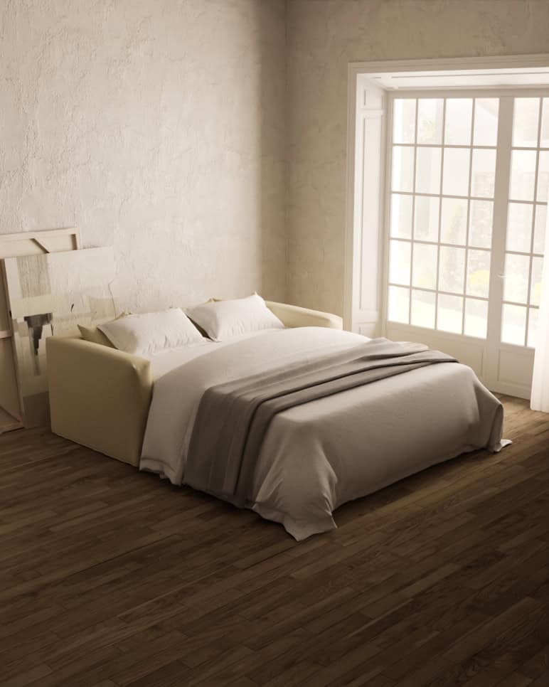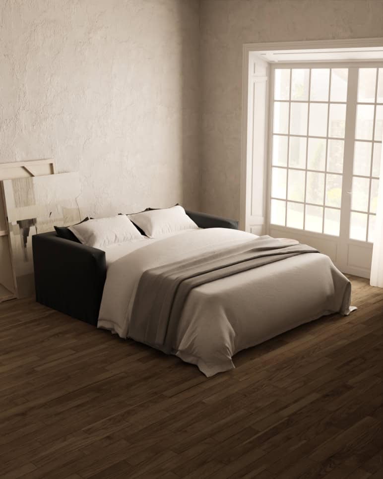 Il divano Parigi è proposto anche nella versione divano letto, sia a 2 sia a 3 posti, perfetta per ospitare con praticità senza rinunciare allo stile.