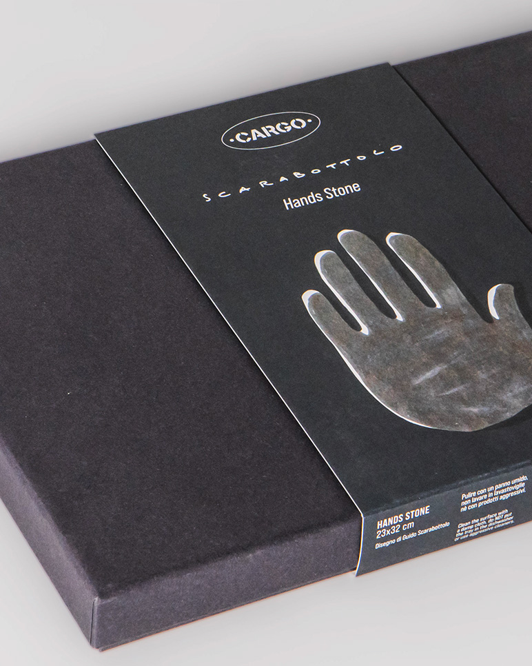 Il vassoio STONE della collezione Hands, realizzato in collaborazione con Scarabottolo, fa parte della Cargo Gallery: la linea di edizioni speciali della Cargo Collection dedicata a oggetti d’arredo e d’uso quotidiano valorizzati dal contributo di illustratori e grafici contemporanei.