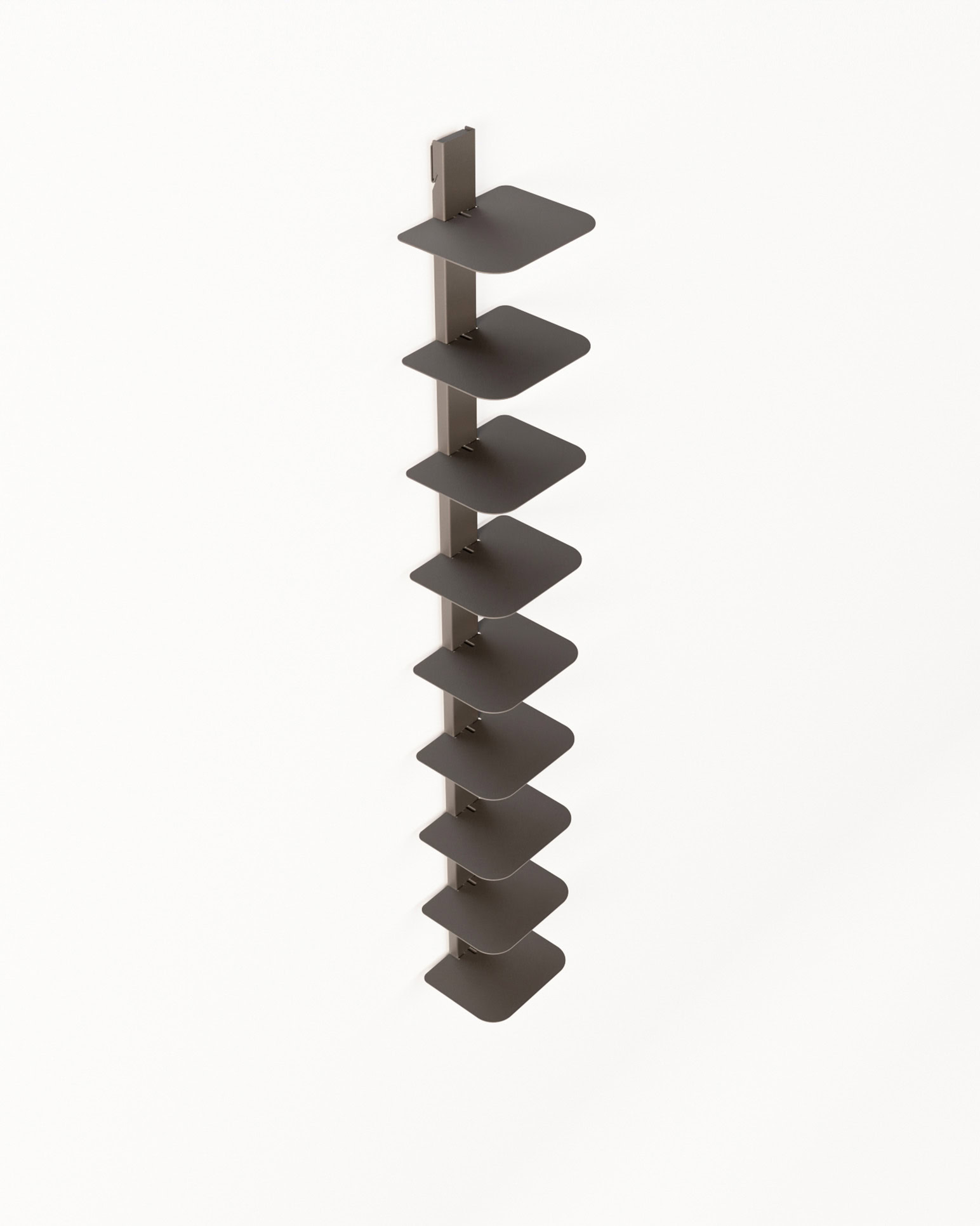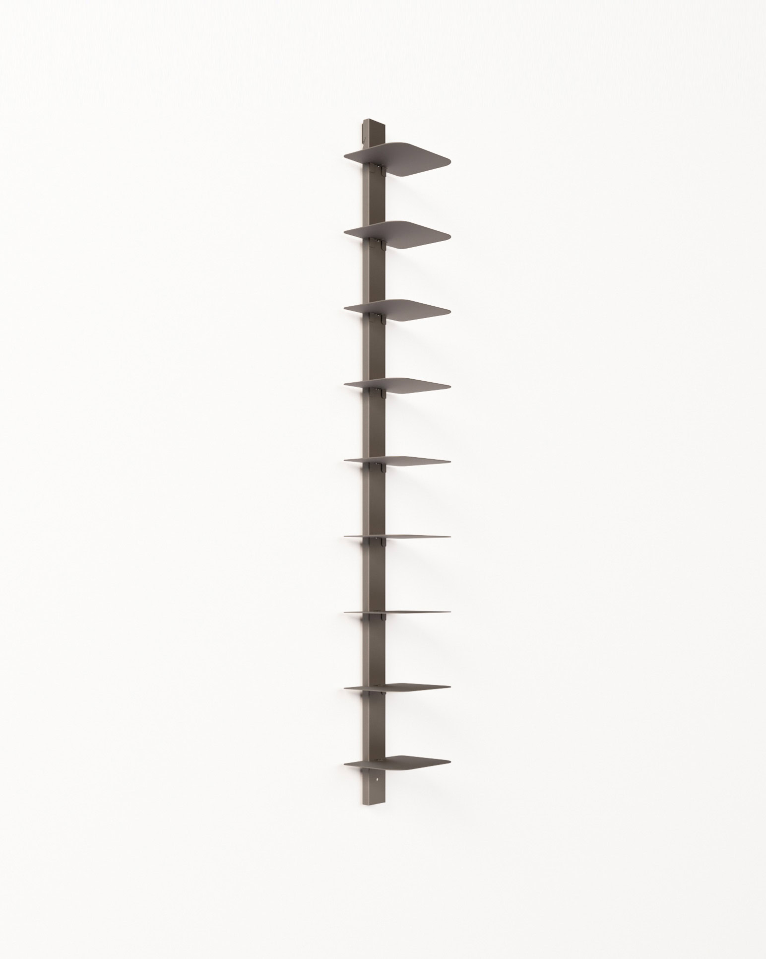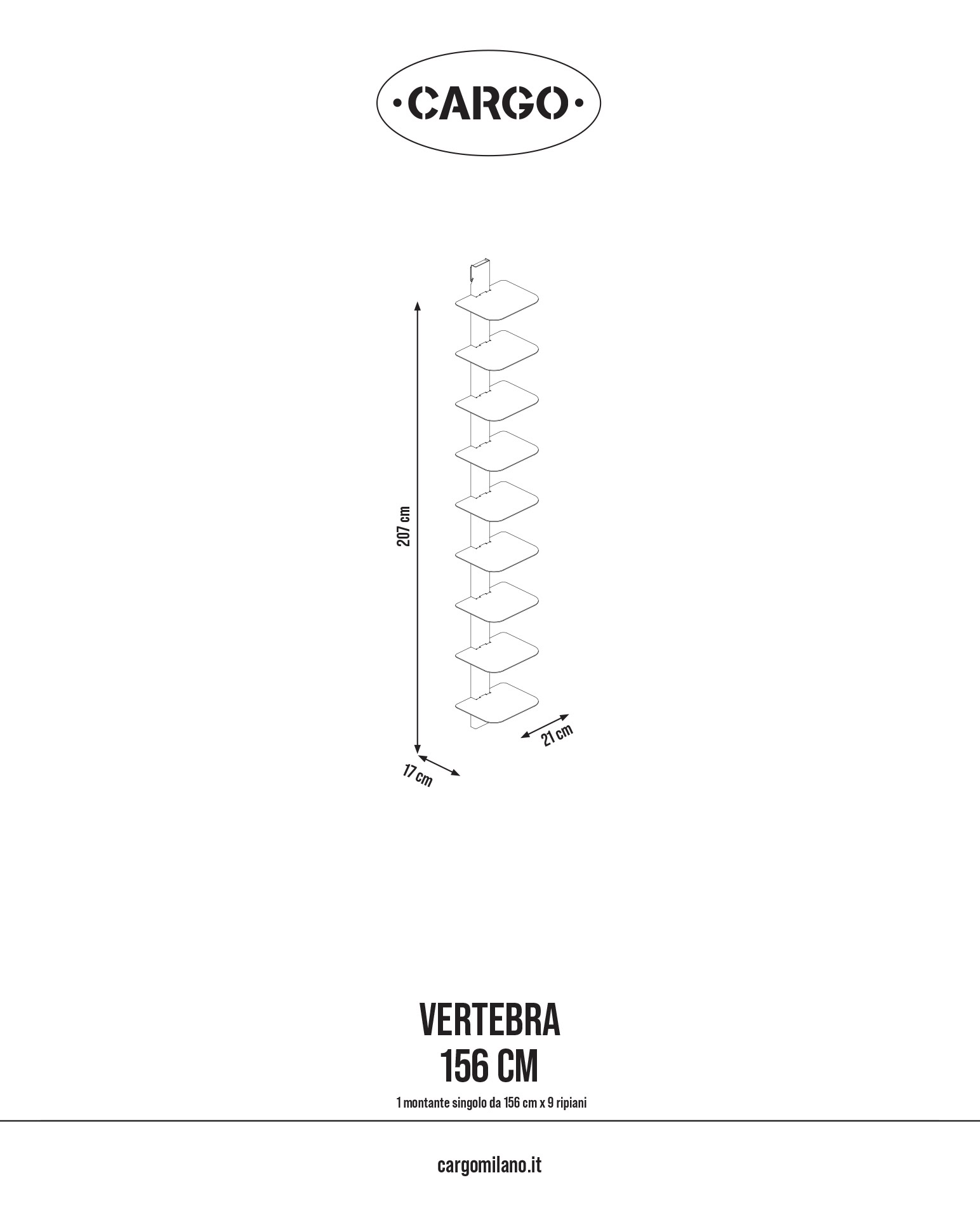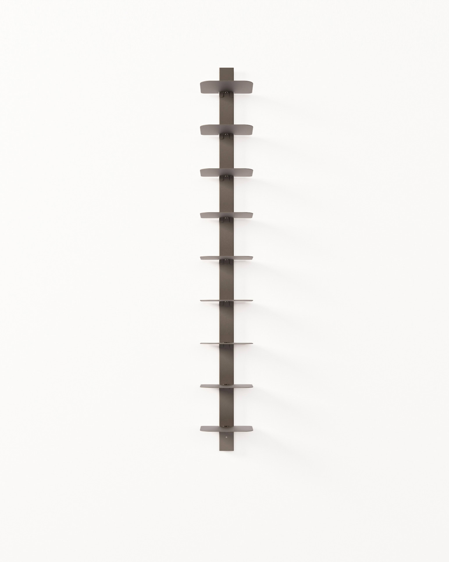 Grazie al design modulare, VERTEBRA è personalizzabile, pratica e facile da montare, perfetta per ottimizzare lo spazio con eleganza. È disponibile in tre altezze (105, 156 e 207 cm) e nei colori bianco, nero e ruggine. Il sistema si completa con la barra orizzontale da 90 cm, che consente il montaggio di tre moduli verticali con mensole, per una soluzione da parete funzionale e di forte impatto estetico.